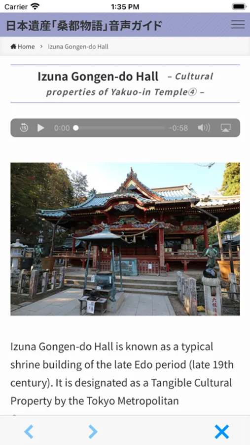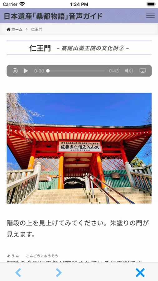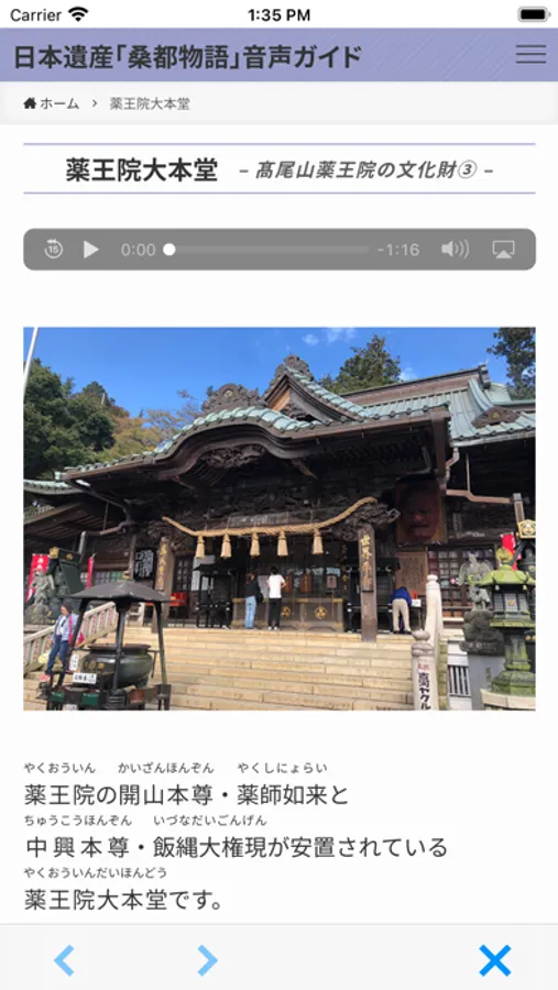 本音声ガイドアプリは多言語(日本語、英語、中国語(簡体字・繁体字)、韓国語)に対応し、構成文化財などを文字・画像と音声(中国語の音声は普通話)でご案内します。日本語は八王子市出身の元NHKアナウンサー・村松真貴子さん、外国語は、最新の音声合成技術によるAI合成音声がナレーションします。