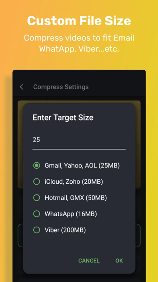 - Compress video to a custom size or fit to Gmail, WhatsApp, Viber, iCloud, Discord, WeChat...etc.
