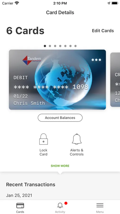 Alerts for PIN and signature transactions can be set up to keep you informed of your card usage and help you quickly detect unauthorized or fraudulent activity. This app can send an alert when a card is used or when a card transaction has been attempted but is declined – and additional customizable alert options are available. Alerts are sent in real time, immediately after a transaction has taken place.