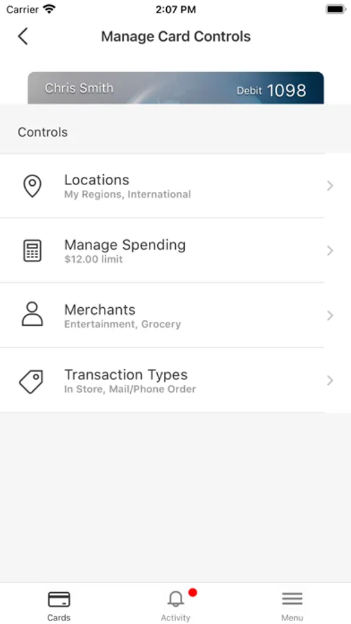 Spending limits can be established to allow transactions up to a certain dollar value and decline transactions when amounts exceed your defined thresholds. Transactions can be monitored and managed for specific merchant categories such as gas stations, department stores, restaurants entertainment, travel, and groceries. And your transactions can also be monitored for specific transaction types: in-store purchases, e-commerce transactions, mail/phone orders and ATM transactions.