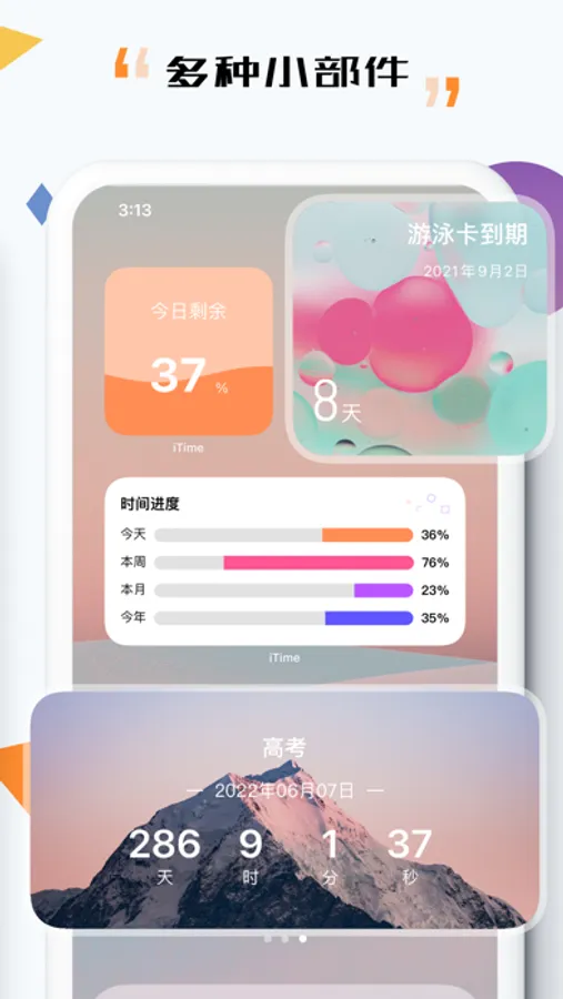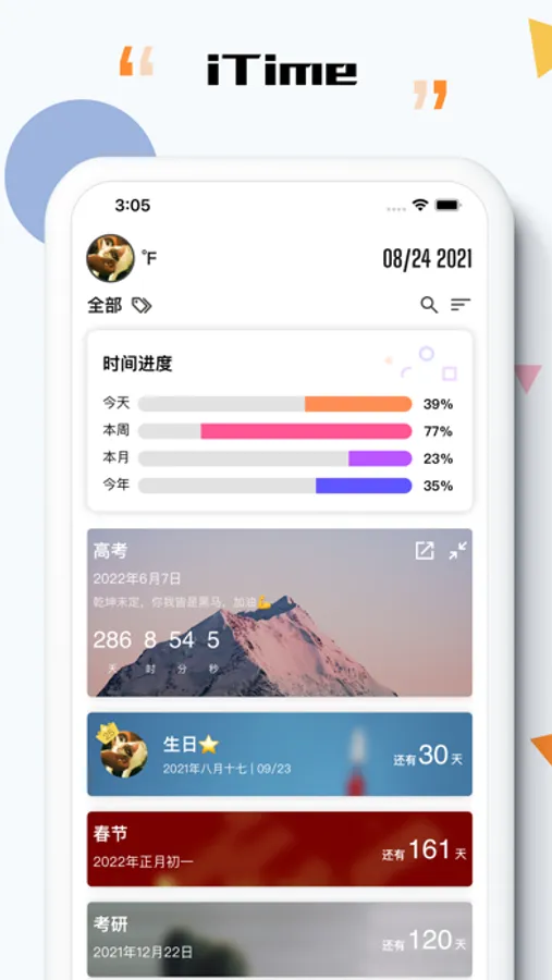 itime is a tiny app for big moments. Countdown the days, minutes, and seconds for any upcoming event. A party, holiday, or an upcoming concert? Sorted. Mark off the days until Christmas? itime will keep you pumped with optional notifications/widgets and refreshing new gifs. itime contains all sizes of widgets with variations to suit your home screen. Share an event with your friends/family so they can join in on the excitement too. You can repeat events and events straight from your calendar.