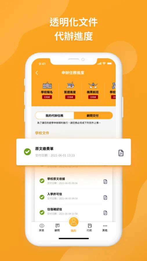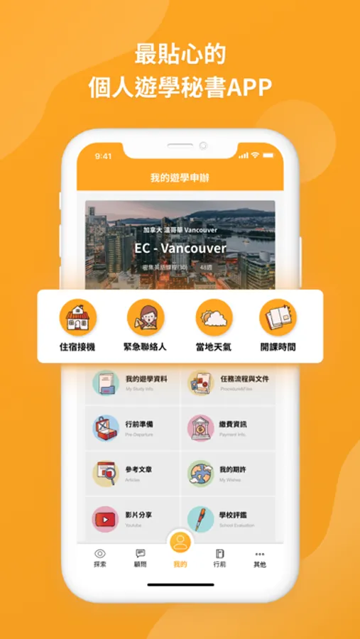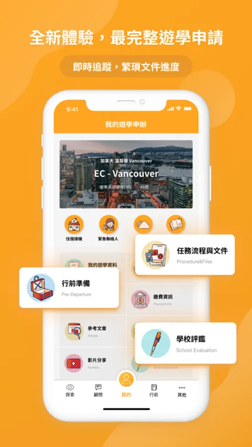 探索資訊 / 學校介紹 / 學費優惠 / 線上報名 / 註冊流程 / 定期通知 / 遊學雜誌訂閱 / 提醒事項 / 學費繳費 /機票 / 住宿安排 / 體檢 / 簽證面試 / 接機服務 / 海外保險 / 行前說明 等文件整合。