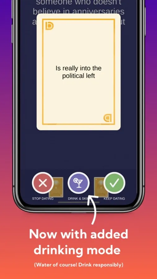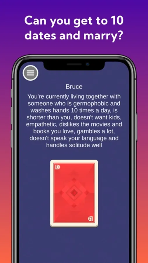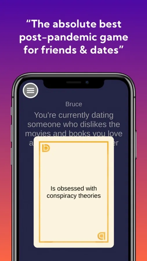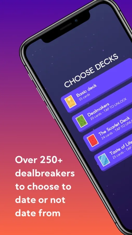 With Dealbreaker you can finally get to know the people in your life! Take turns drawing a card with an attribute such as "Is richer than you" or "Pees in the shower" and decide if this attribute is a Dealbreaker for you or if you would go on a another date with this person after learning this new information.