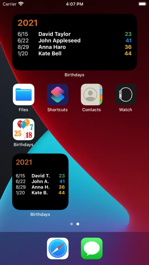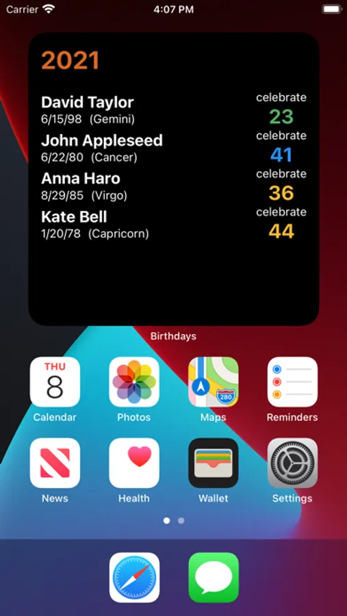 - notifications - 2 different types, you get reminded a birthday alarm at the exact right moment.