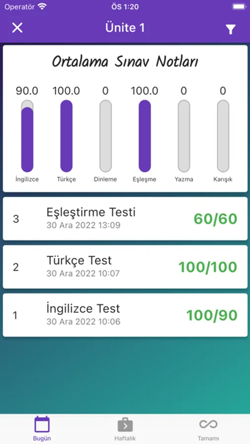 Veliler ve öğrenciler sınav sonuçlarını günlük, haftalık ve tamamını ayrı ayrı olarak ve sınav tipine göre filtreleyerek görebilmektedirler. Program bir sözlük olarak da kullanılabilmektedir. Her bir öğrenci bu uygulama sayesinde tatilde de olsa, bir öğretmen tarafından eğitiliyor kalitesiyle, kelime hazinesi gelişmiş olarak tatilden dönerek okula başlayacaktır.