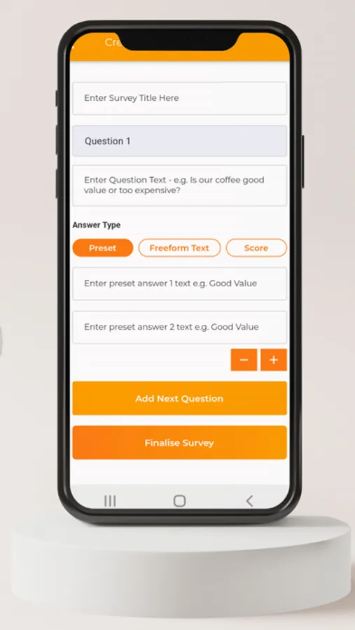 Surveys are simple and extremely quick to create and launch at the location of your choice. Answers can be preset, free text or a score out of ten, depending on your needs. You can even offer a discount code for responders to use when they visit you again.