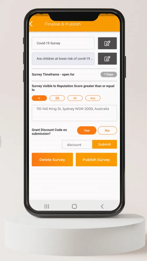 Surveys are displayed on a map at the location of your choice. A customer at your store can find and access your survey on their smartphone in seconds, no links are required.