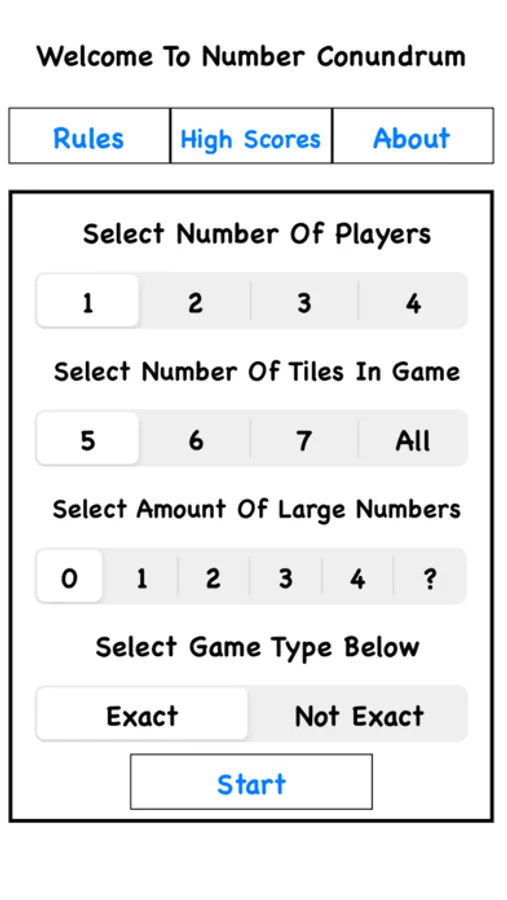 When selecting the numbers to be used in any particular game round, the computer selection will be picked from any amount of large numbers which are 25, 50, 75 and 100, and the remaining small numbers to be used in the round will be chosen from 20 numbers being 2 sets of numbers from 1 to 10.