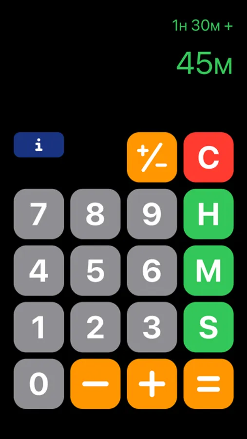 But multiplication (×) and division (÷) are not available, due to the fact, that e.g. 1h30m × 2h45m cannot produce a meaningful result and changing between times / durations (1h30m) and Numbers (4) on the display seems confusing to me, in my opinion leading to an inferior product.