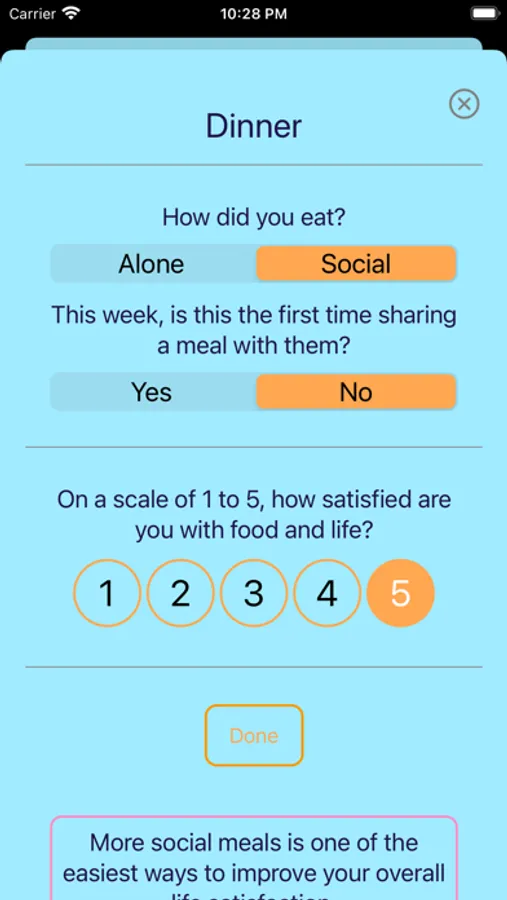 Enjoy your life more through the power of mindful social eating. Each day we will prompt you to toggle your meals as social or lonely and record your life satisfaction. Our app will help you gather insights on how much social eating you need in a given week to feel at your best. We’ll also encourage you to plan more social meals.