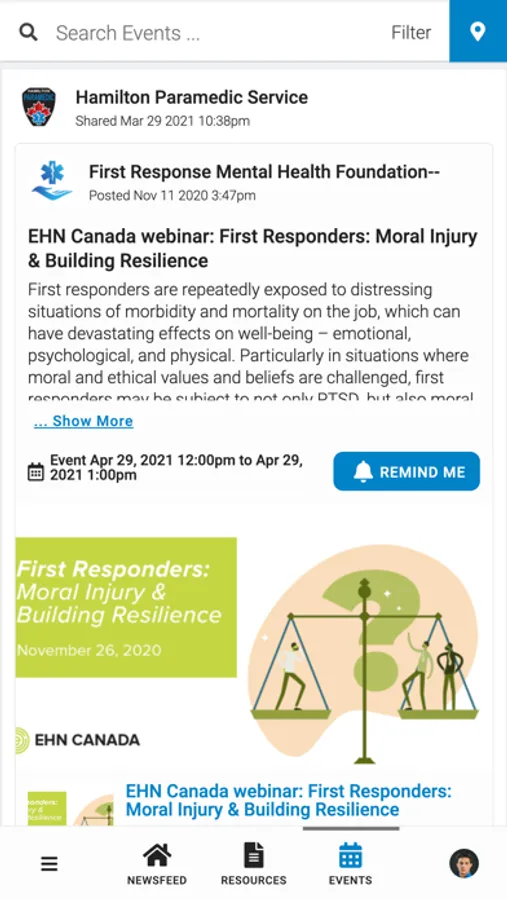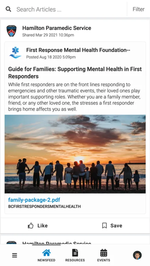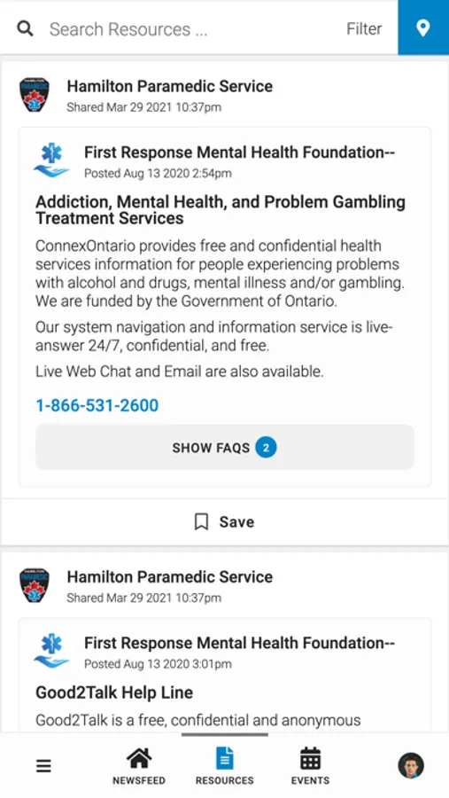 Hamilton Paramedic PeerConnect connects the public to information about Hamilton Paramedic's programming and services. Users have access to newsfeed articles, resources, and events related to mental health, wellness, culture, and belonging.