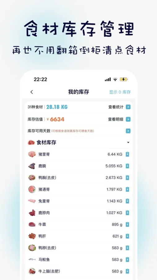 4、食材库存管理:可以记录日常屯肉数据,结合喂食记录进行核减,同时可以通过参照食谱分析库存剩余可用天数、库存金额
