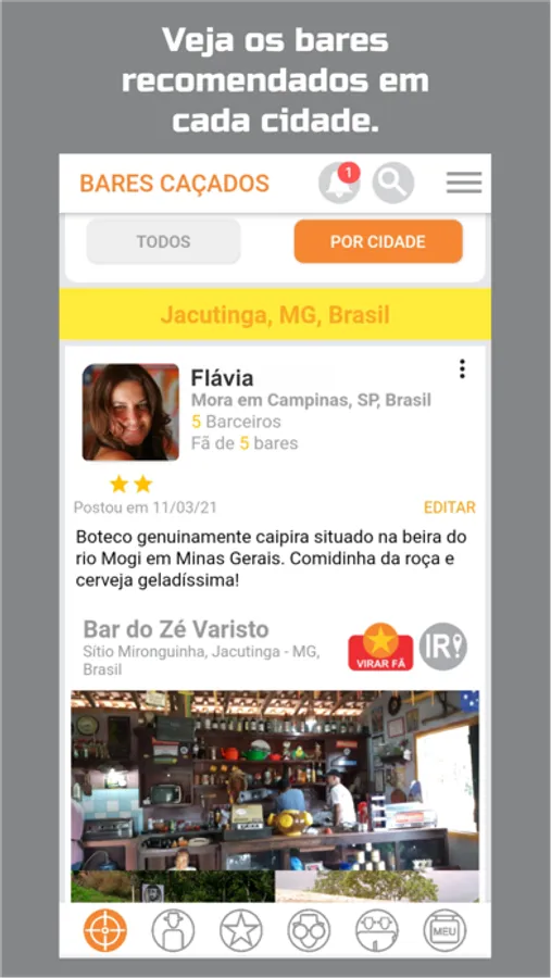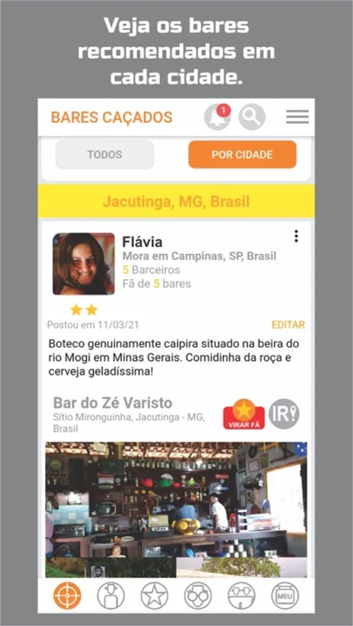 Página Bares Caçados - Esta página apresenta os posts feitos por Caçadores ou Caçadoras que querem divulgar um bar que foram, gostaram e recomendam. Existem algumas regras para que o post de um bar que foi “Caçado” seja publicado. Um Dono de bar não pode postar nada sobre seu próprio bar nesta página, pois são seus clientes que devem divulgá-lo para maior credibilidade junto à comunidade dos Caçadores de bares. Os usuários podem escolher como querem ver os posts de bares que foram “caçados”, se todos os bares ou por cidade. Os usuários podem editar seus posts e, nos posts feitos por outros nesta página, podem brindar, comentar, ver os comentários e até denunciá-lo se for o caso de não estar de acordo com as regras ou termos de uso do app. Cada post apresenta os ícones “Virar fã” (do bar) e “Ir”. Ao clicar em Virar Fã o usuário passa a seguir a página do bar e todas as suas postagens. Ao clicar em “Ir” o app abre outro aplicativo de mapas e indicação do trajeto até o bar via GPS.