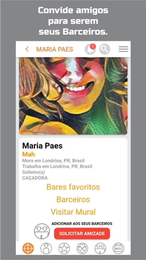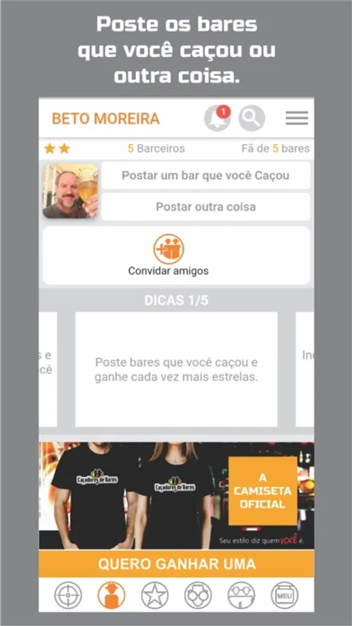 Outras áreas - os usuários podem convidar amigos para os Caçadores de Bares, receber dicas, ver anúncios, receber notificações e mensagens e buscar por usuários e bares.
