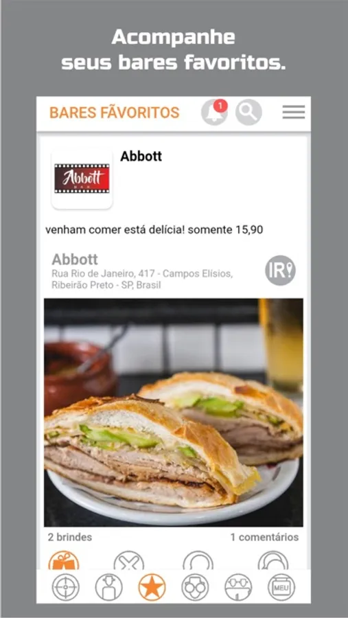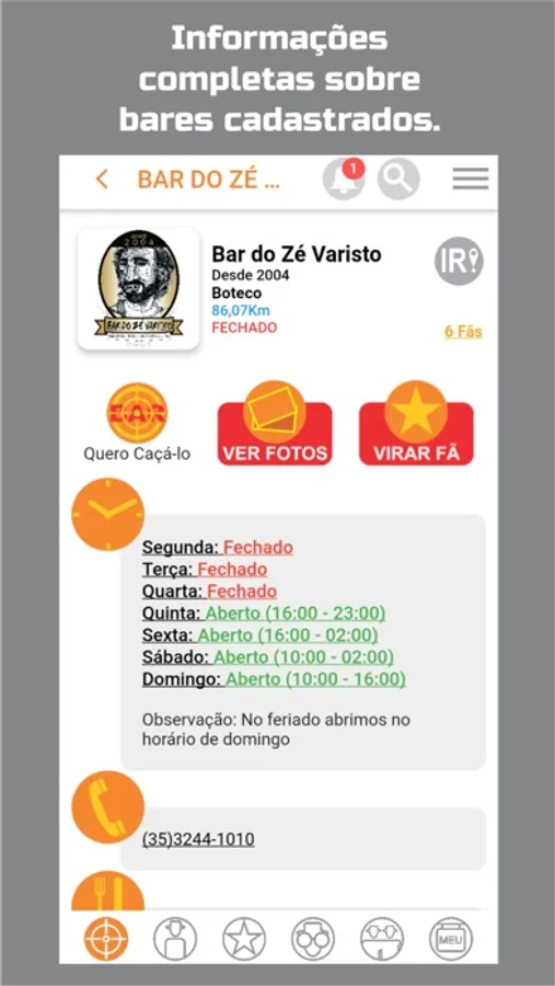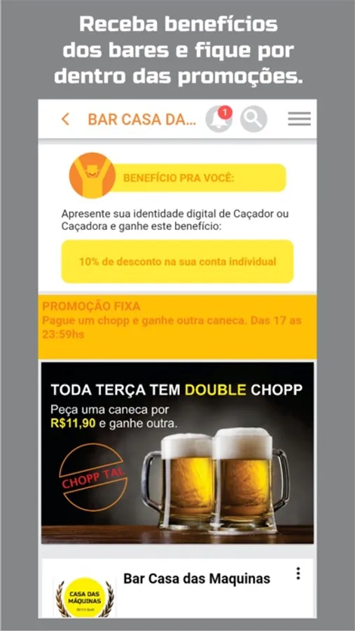 Páginas dos Bares - Quando um usuário clica sobre a marca ou o nome de um bar postado, se ele estiver sido cadastrado no app, a página do bar se abre. Nela o usuário pode ver muitas informações sobre o bar. É nesta página que o usuário se informa qual o benefício que o bar oferece para os Caçadores e se existe uma promoção fixa.