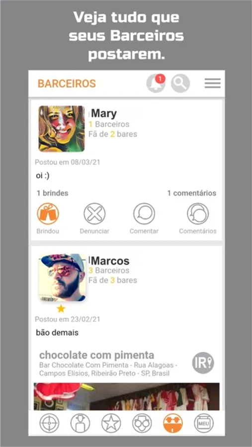 Página Barceiros - Esta página exibe todos os posts feitos pelos Barceiros (amigos) de um usuário, seja um bar caçado ou outra coisa qualquer. Tudo que o usuário posta também aparece nesta página para que seja visto pelos seus barceiros.