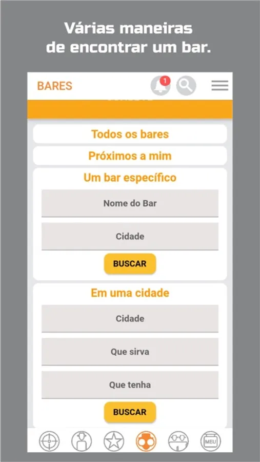 Página Bares - Nesta página o usuário pode buscar de diversas formas pelos bares cadastrados no app. Pode escolher entre as opções: Todos os bares; Bares próximos a ele; um bar específico, pelo nome do bar e cidade onde ele se encontra, ou um bar que sirva e tenha o que ele queira em uma determinada cidade