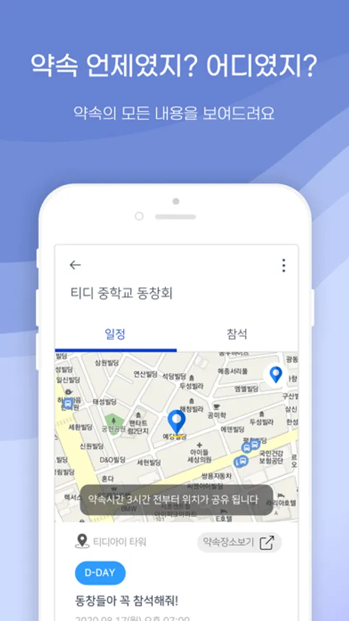 언제, 어디서, 누구와, 왜 만나기로 했는 지 상세히 보여드려요.