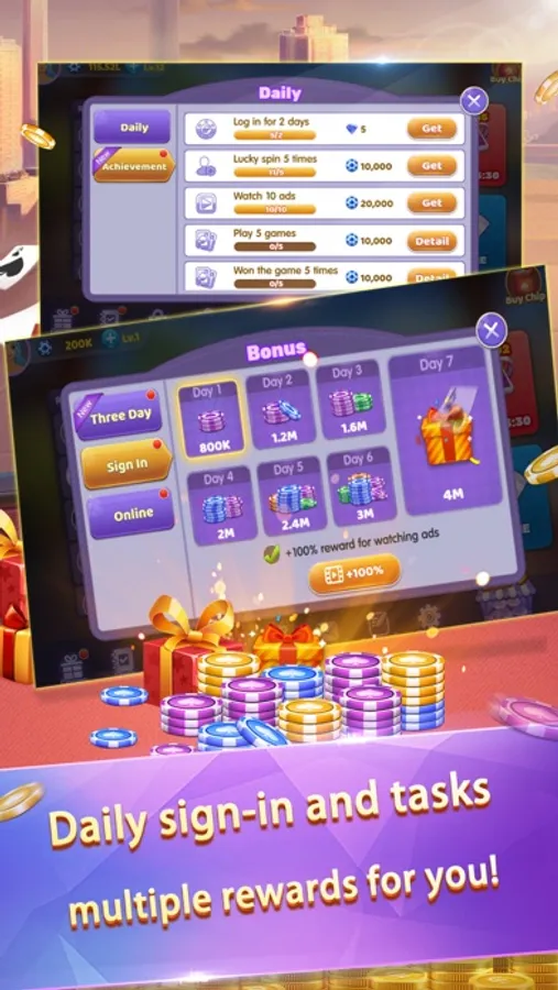 1. Free download, free play. Daily tasks, online rewards and many other methods to get a large number of free chips.