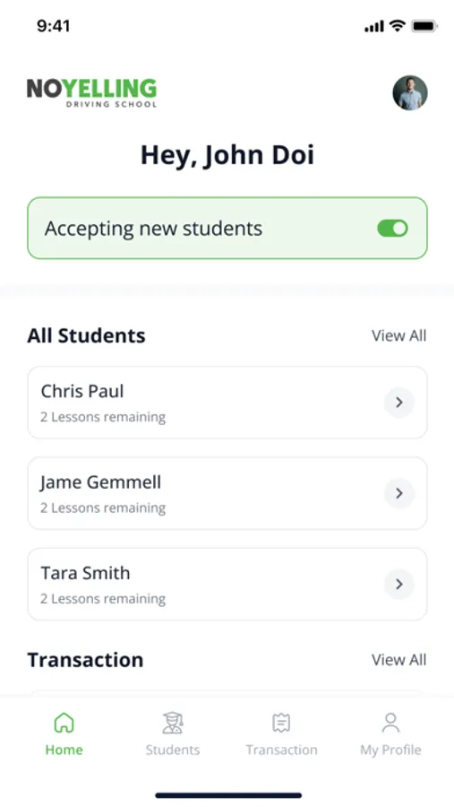 The No Yelling Driver app is designed to make working with No Yelling a breeze. View your students and records, your income, and take payments, all in one easy to use app.