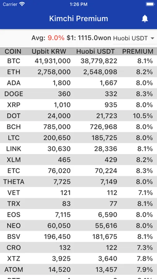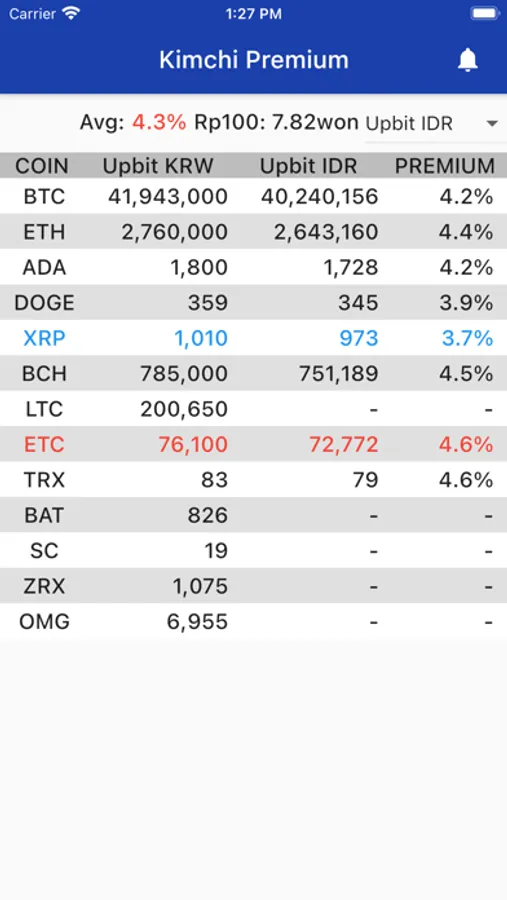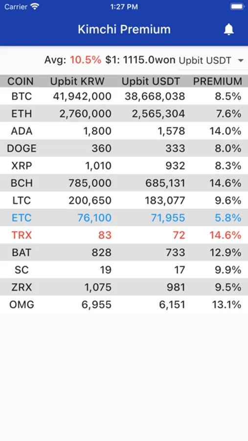 Check the Kimchi Premium, which is the price difference between Upbit Coin and the selected exchange.