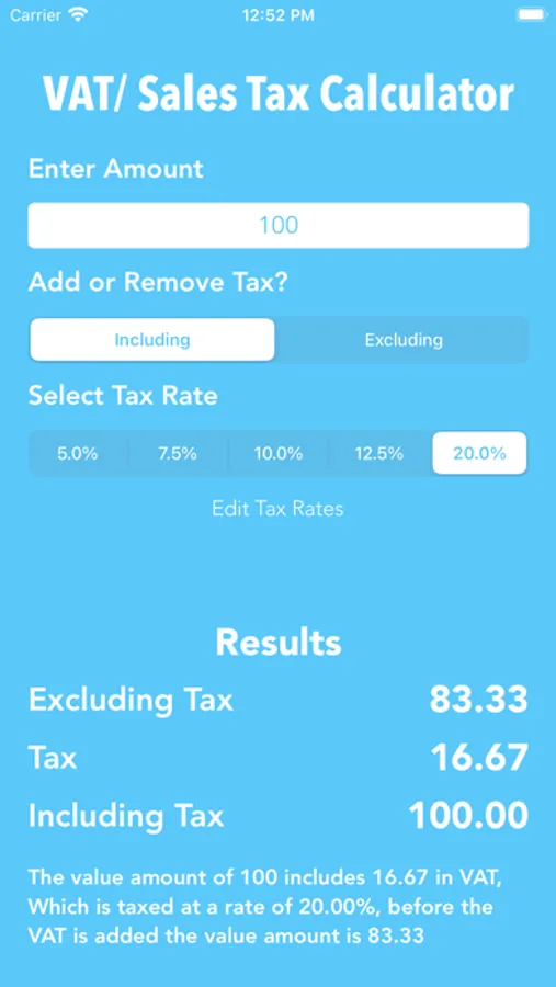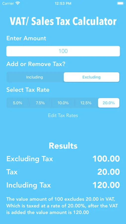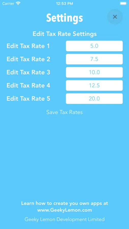 Easily edit up to 5 saveable Tax rates for fully customise calculations and easy returnable access.