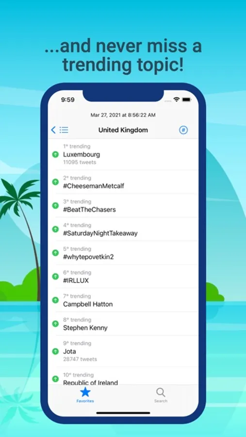 Trending All Over let you select all the locations you want to follow, save them as favourites and see what's trending there. You don't need to switch your location on Twitter, the trending topics you want to know are just a tap away!