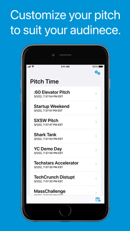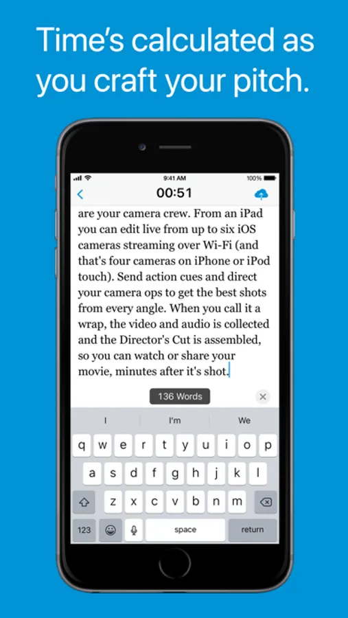 Pitch Time is a speech preparation focused app that tracks your word count as you type and calculates delivery time. When you've finished your first draft, practice reading your pitch with the timer. If you find you're off on time simply adjust the spoken word count in the settings and revise your pitch if necessary.