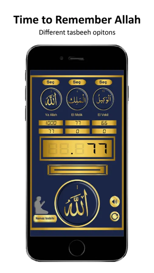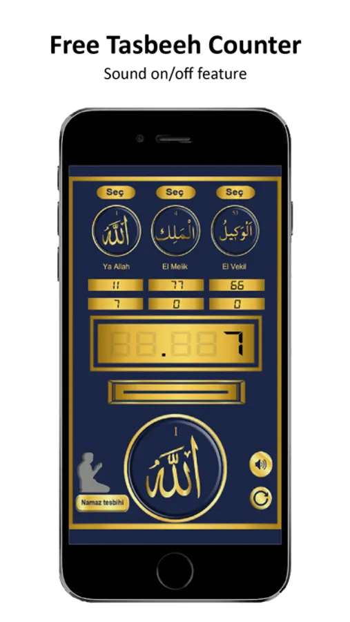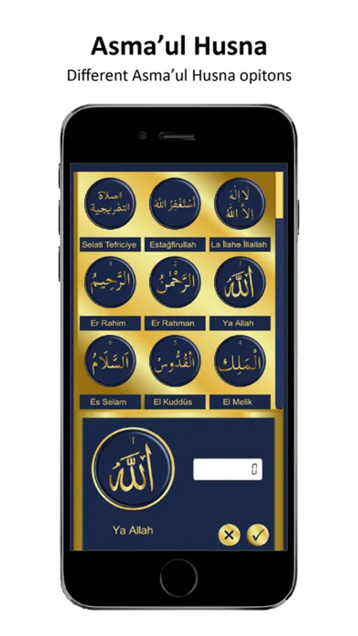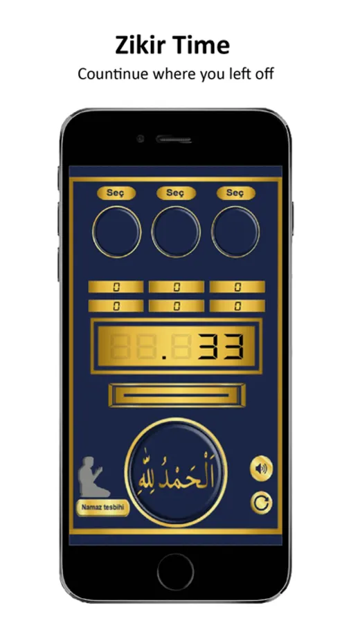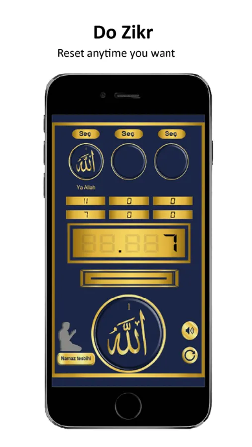 Through pressing one of the three zikr select buttons on the top of the screen you can reach 99 names of Allah (Esma-ul Husna) and other tasbeehs. Select one of these tasbeehs with a target zikr number that you choose.
