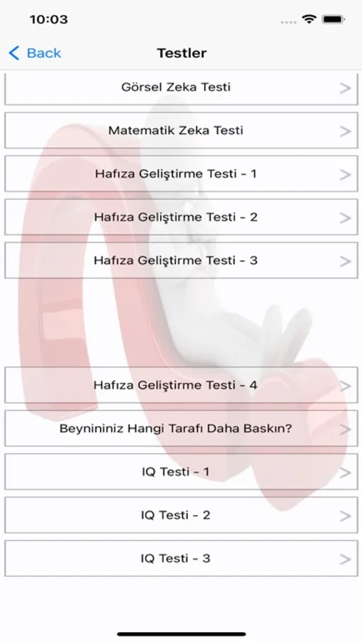 Uygulamayı kullanarak beyin ve hafıza geliştirmeye yardımcı içeriklere, testlere ve oyunlara ulaşabilirsiniz.