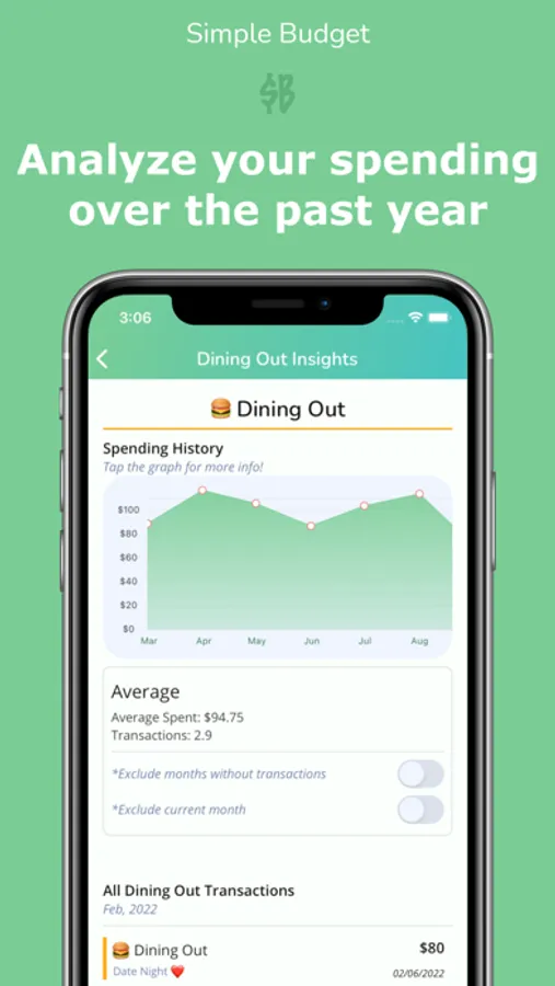 Look at how your spending has changed month to month, so you can see how future spending will look. You can view your spending history over the past year to see where you can save and where you're spending too much.