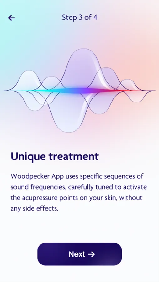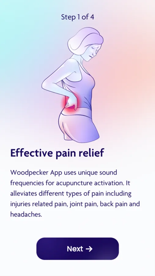 The Woodpecker App uses specific sound frequencies that activate skin acupuncture points triggering the brain to release endorphins - the body's natural substance that takes away the pain and inflammation.