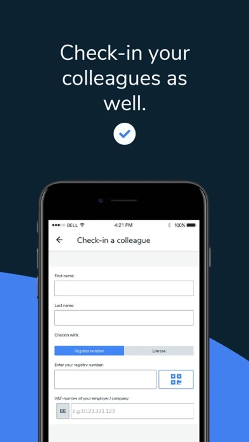 You easily check yourself in by creating an account in the app on your smartphone using your national register number or LIMOSA number (for foreign employees). You can also check in colleagues. Once you arrive at the site you can look it up in the list of locations. There you can easily and quickly register your check-in and you are legally all set.