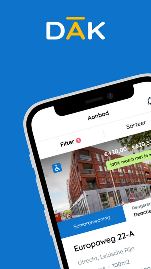 Welkom bij DĀK! DĀK is de nieuwe manier om eenvoudig naar een nieuwe huurwoning te zoeken. Log in met je bestaande WoningNet-account. In een paar simpele stappen neemt DĀK jouw wensen op en brengt je daarna naar een duidelijk overzicht van alle beschikbare woningen. Een reactie plaats je met een klik. DĀK houdt je volledig op de hoogte van de voortgang van jouw reactie.