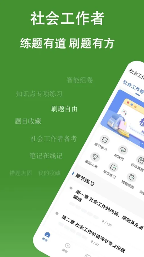 社会工作者考试题库是考生专用的实现科目练习和模拟考试的手机端APP软件,集智能辅导、详细解析、和考试考情于一身,涵盖该考试热点、难点和常考点,有社会工作者考试的各个科目的历年真题集、模拟试题题集、章节练习,提供社会工作者考试备考刷题练习,包括题库中的试题、模拟考试等功能,是各位考生学习备考的帮手。