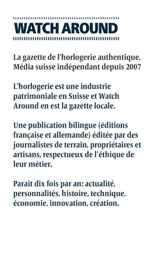 L’horlogerie est une industrie patrimoniale en Suisse, Watch Around en est la gazette locale. Publication bilingue (éditions française et allemande), éditée par des journalistes de terrain, propriétaires et artisans, respectueux de l'éthique de leur métier et observateurs du secteur horloger au sens large: actualité, histoire, technique, économie, innovation, création.