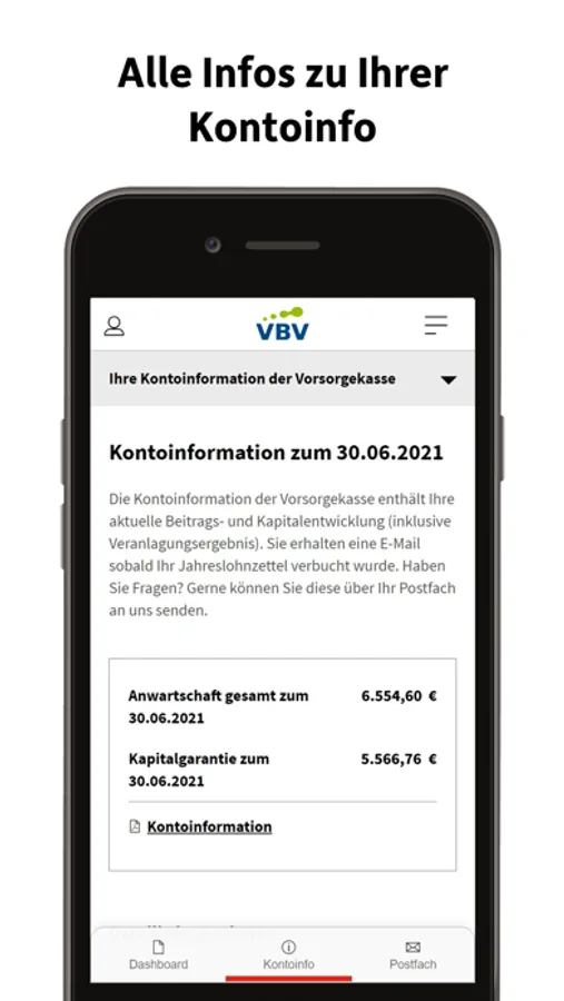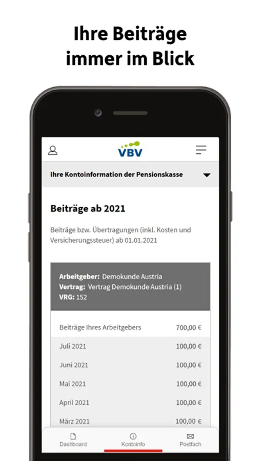 Bleiben Sie auf dem Laufenden: Ihre Beiträge der VBV-Pensionskasse und VBV-Vorsorgekasse werden monatlich aktualisiert. Sehen Sie sich Ihre Kontoinformationen und Kapitalstände bequem am Smartphone und Tablet an. Kunden der VBV-Pensionskasse und der VBV-Vorsorgekasse sehen eine gesamthafte Darstellung Ihrer Leistungen und Kapitalstände.