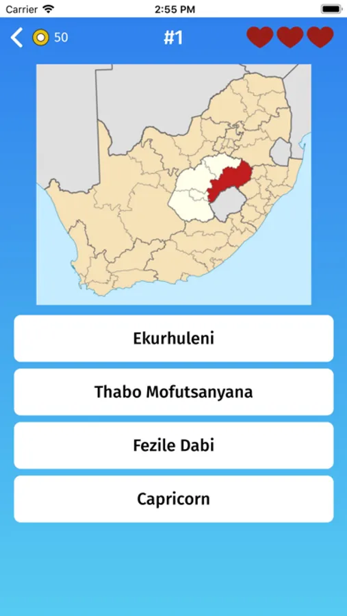 - Multiple choice: guess the provinces of South Africa, by selecting one of the variants.