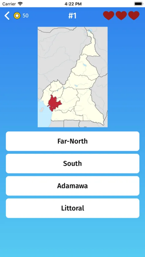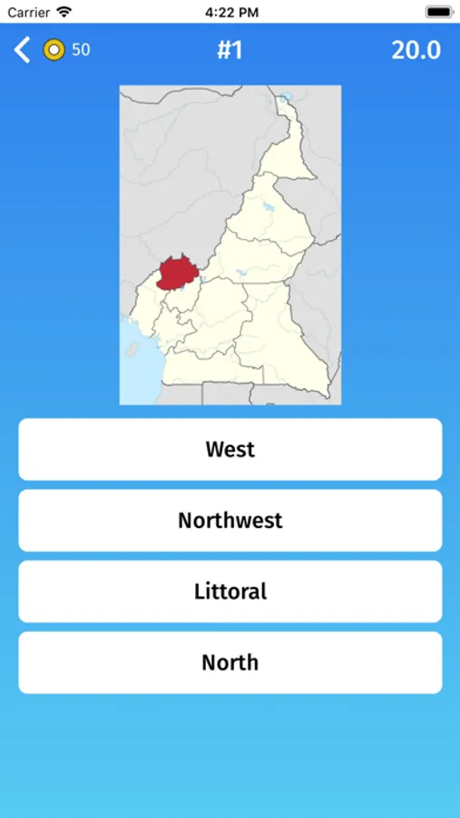 - Multiple choice: guess the provinces of Cameroon, by selecting one of the variants.