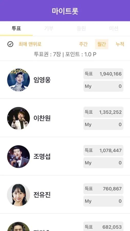 - 내 가수에게 투표하고 1위로 만들어보세요.