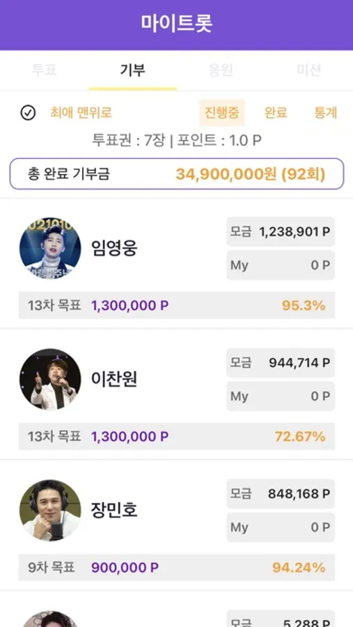 - 다양한 미션을 통해 얻은 포인트로 내 가수 이름으로 도움이 필요한 곳에 기부도 하고 최애가수를 국민기부천사로 만들어 줄 수 있어요.