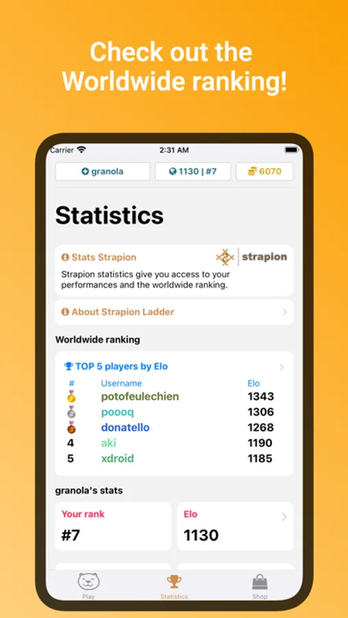 * Like in Chess, each win will increase your Elo rating, so it's up to you to climb the worldwide leaderboard.