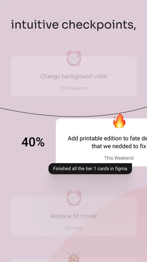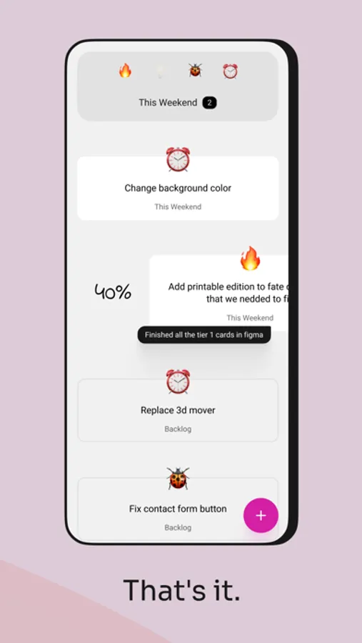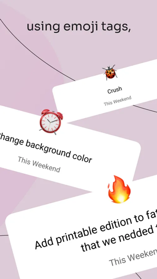 Starting a side project without weekend? Why? weekend is the better-chances way to push your side project, using emoji tags (based on your own associations, instead of tedious words and colors), intuitive checkpoints (eyeball a % and leave a note, so you can remember where you took off last time you worked on a task), and flat editing (to make everything super clear with no hidden features).