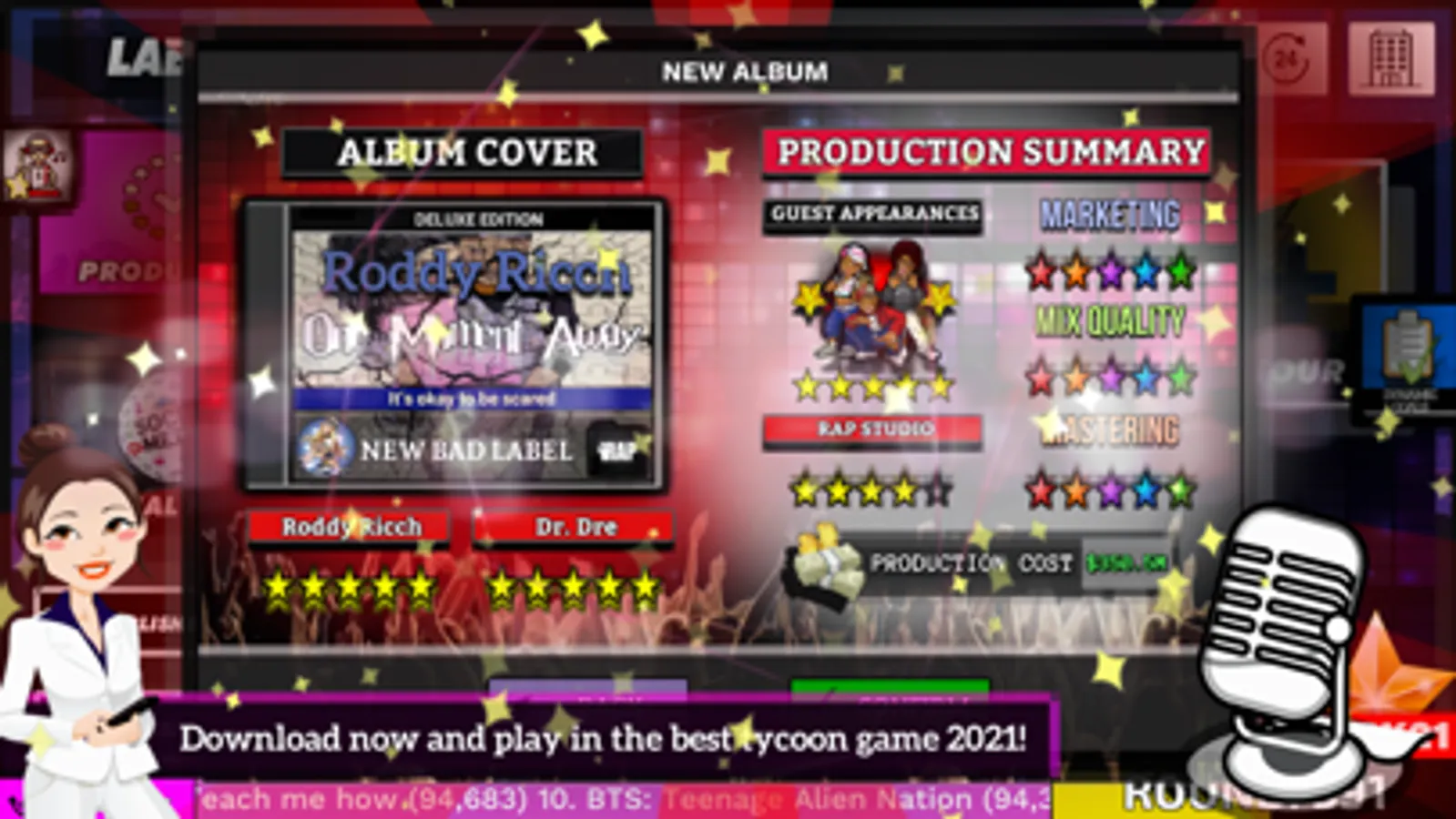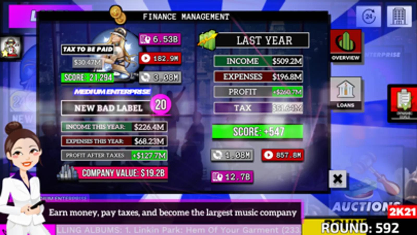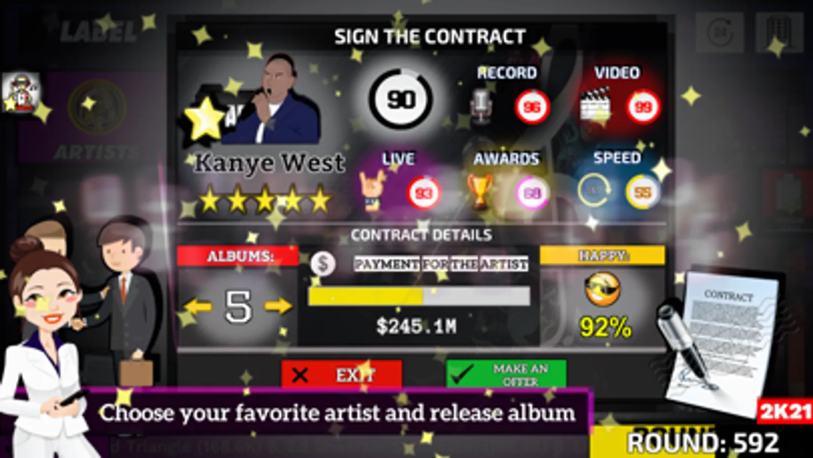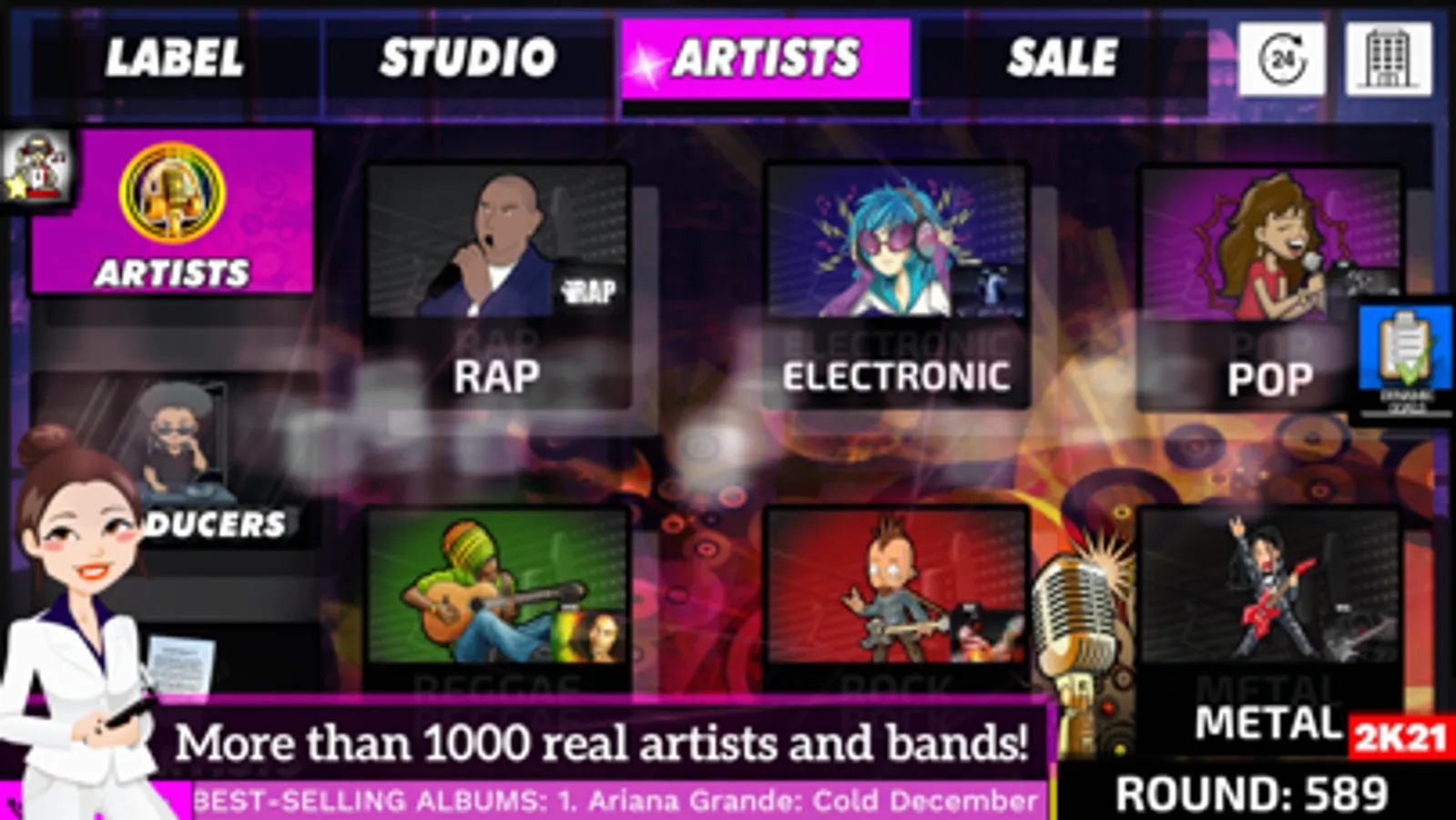 MusicLabelManager is a music industry simulator that allows players to create and run their own record label. Players take the role of CEO and try to make their mark on the music industry. The game has a database with more than 1000 real artists with stats for 2021. Music awards, singles, concert tours, streaming services and much more!