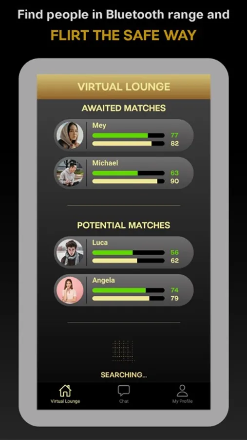 LOUNGE uses your Smartphone’s Bluetooth to detect users in your immediate environment. If both user's profiles match, they will receive a private notification on their Smartphones. Only if both users confirm the match, the chat function will be made available so you can connect privately. When you’re using LOUNGE the geo-location will not be used – your location is private and none of our business – all you need to turn on is your Bluetooth.