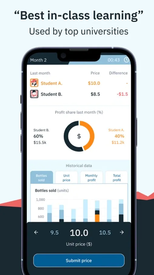 Dilemma Student allows students to participate in interactive activities during their higher education classes. Activities are prepared by Professors. Students answer surveys and participate in multiplayer simulations to learn more and better about concepts in their courses. After a class is over, students can check the results of their simulations and and compare them to the overall class!