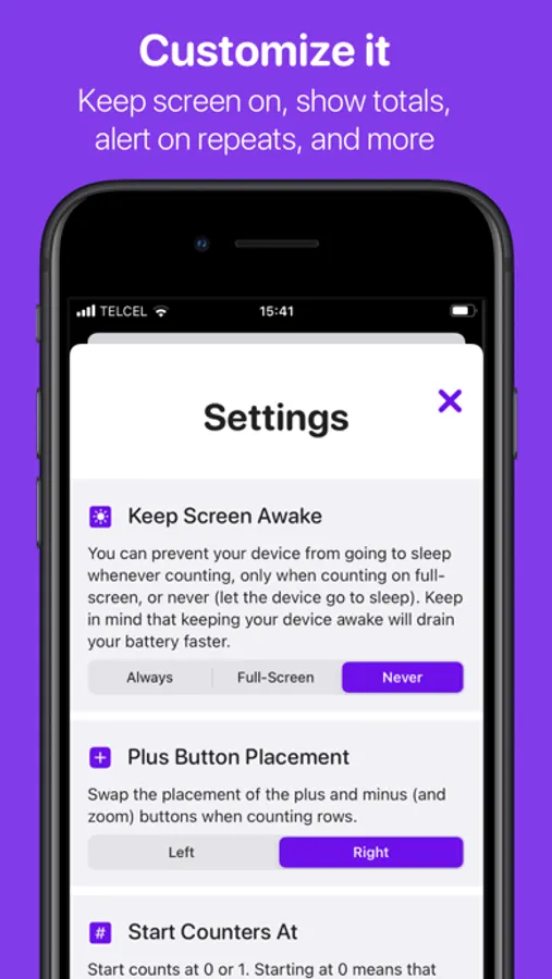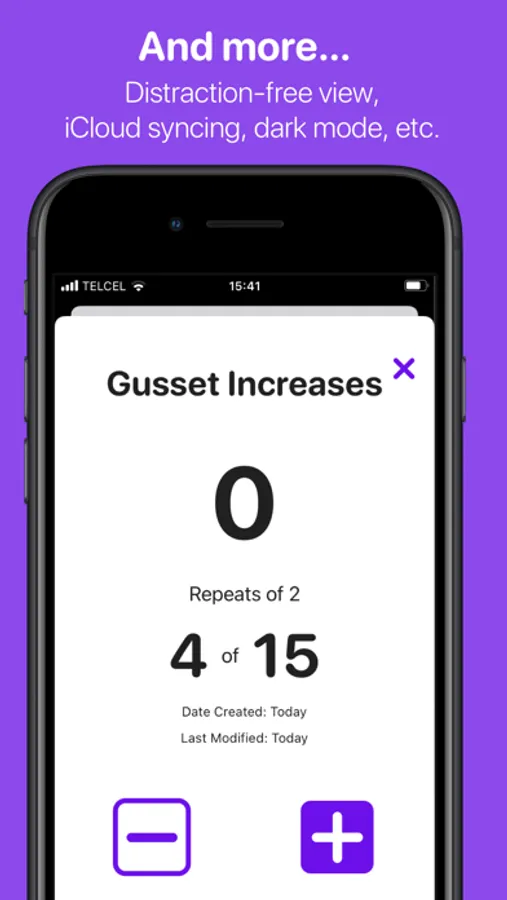 * Alerts: Be alerted at the beginning of each repeat (optional). Keep track of how many rows or repeats you need to complete, and be alerted when you reach it.