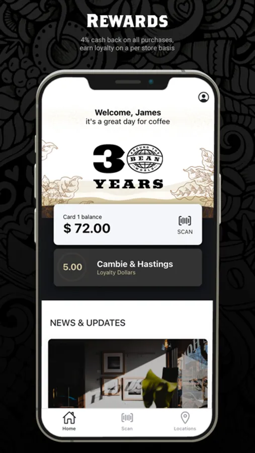 Each scan earns you 4% loyalty at your favourite Bean! Detailed loyalty breakdown for all locations is at your fingertips and updates are instant.