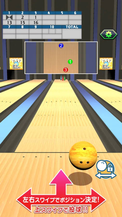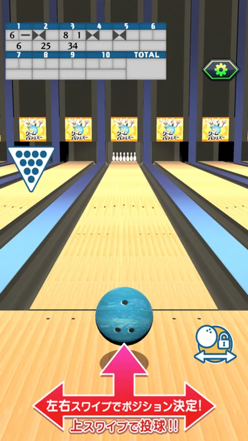 前後左右の軌道変更によって、複雑な配置のピンを順番通り倒しましょう。