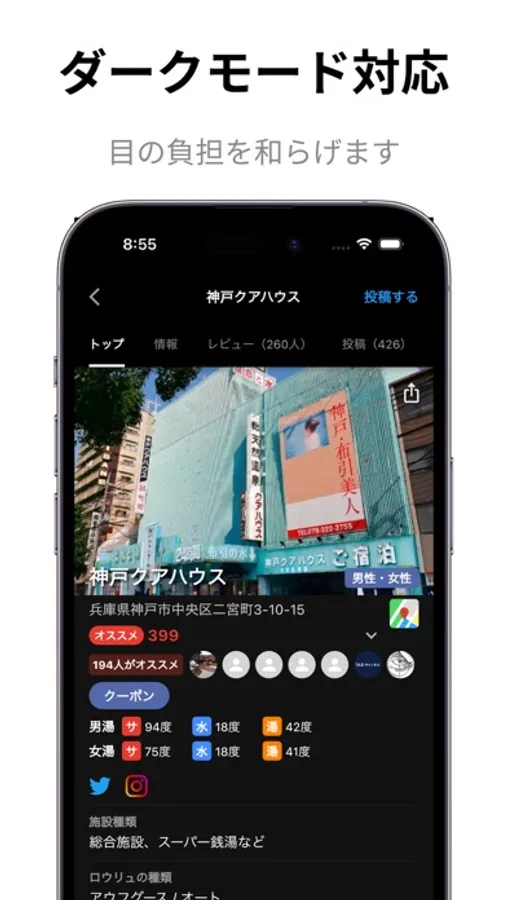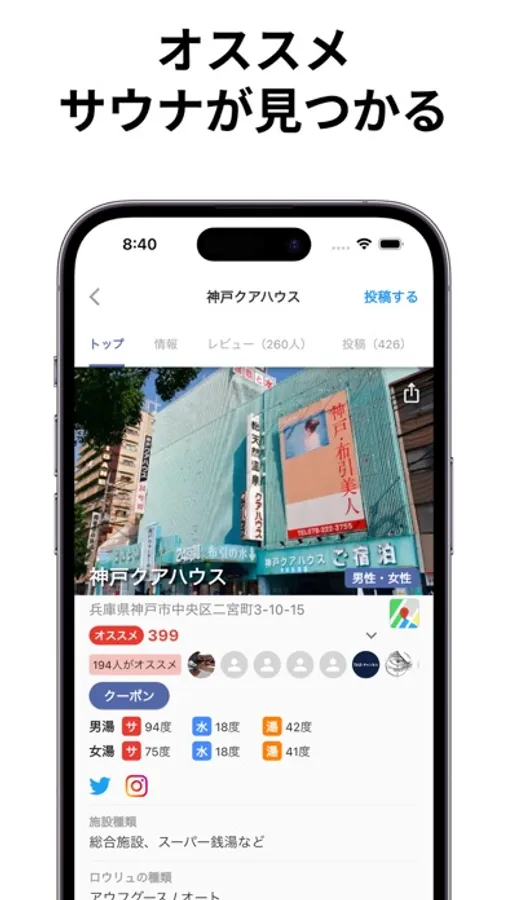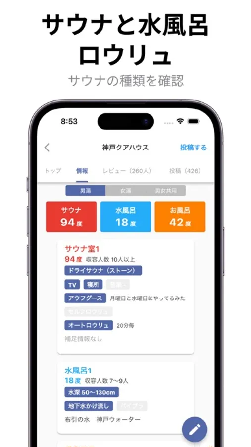 ユーザーによって投稿された施設の温浴情報を公開しています。サウナの温度、水風呂の温度、ロウリュの種類などサウナーが知りたい情報を確認できます。また、マップ上での絞り込みも可能です。